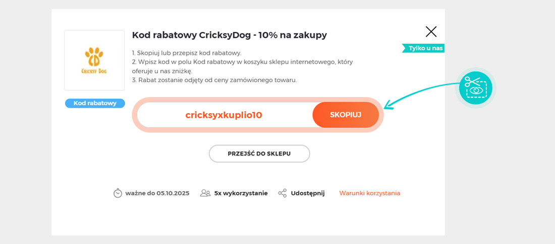 Skopiuj lub zapisz kod rabatowy i kliknij przycisk "Przejdź do sklepu". Nastąpi przekierowanie bezpieśrednio do sklepu internetowego Cricksydog.pl.