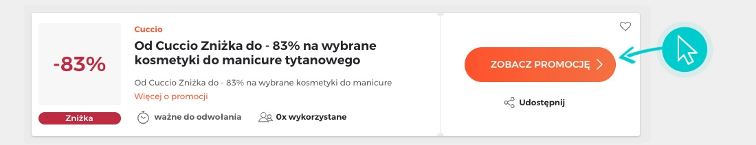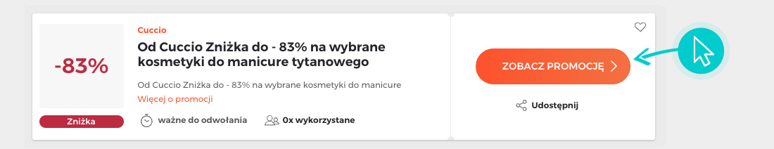 Wybierz konkretny rabat z Cuccio na naszej stronie i kliknij przycisk "Zobacz promocję". Zostaniesz automatycznie przekierowany do oferty promocyjnej w sklepie internetowym Cuccio.pl, gdzie możesz kupić wybrany produkt ze świetną zniżką.