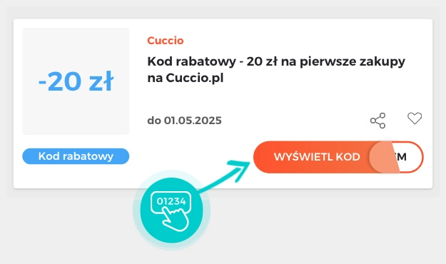 Wybierz na naszej stronie konkretny kod rabatowy, którego chcesz użyć w sklepie internetowym Cuccio.pl. Następnie kliknij pomarańczowy przycisk "Wyświetl kod".