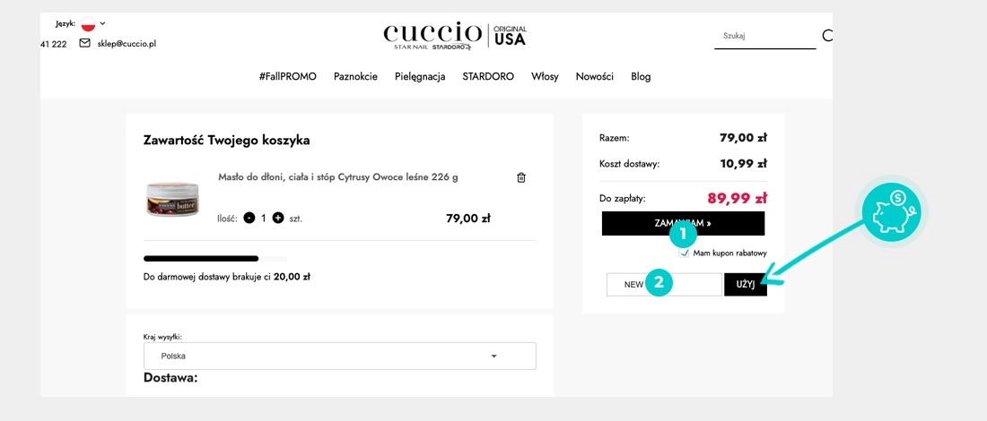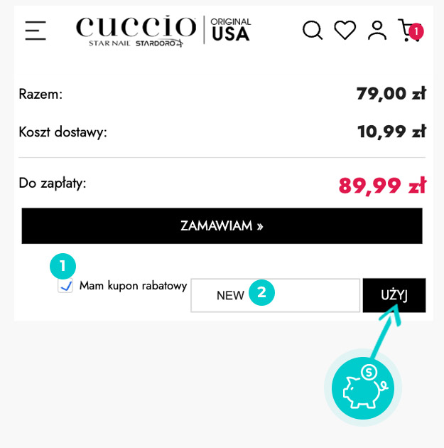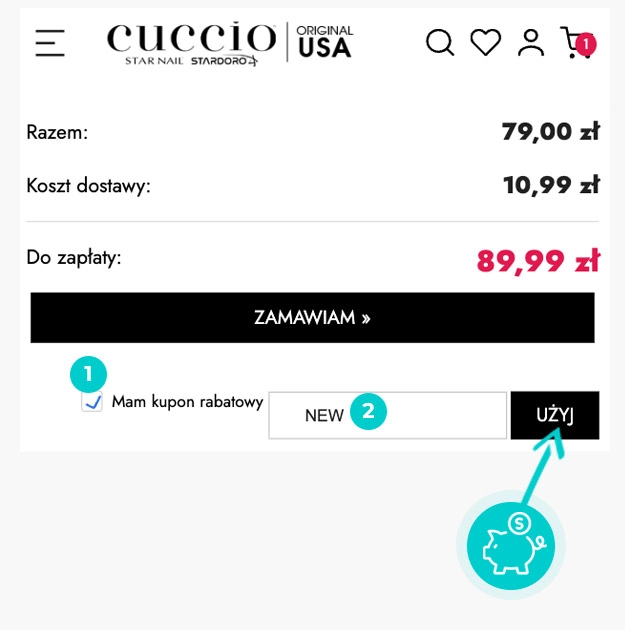 Wybierz w e-sklepie Cuccio.pl produkt, który Cię interesuje, naciśnij przycisk "Do koszyka", a produkt automatycznie zostanie dodany do Twojego koszyka z zamówieniem. Po prawej stronie, w sekcji "Zawartość Twojego Koszyka" znajdziesz pole "Mam kupon rabatowy". Tutaj wklej skopiowany kod rabatowy bądź wprowadź go ręcznie, i zatwierdź przyciskiem "Użyj", a następnie zaznacz "Zamawiam".