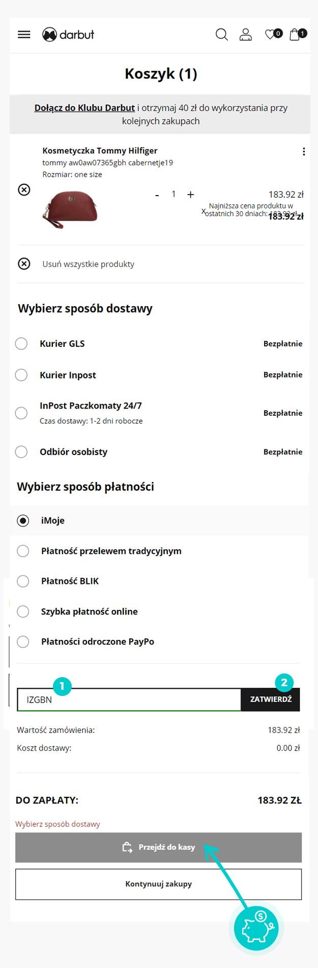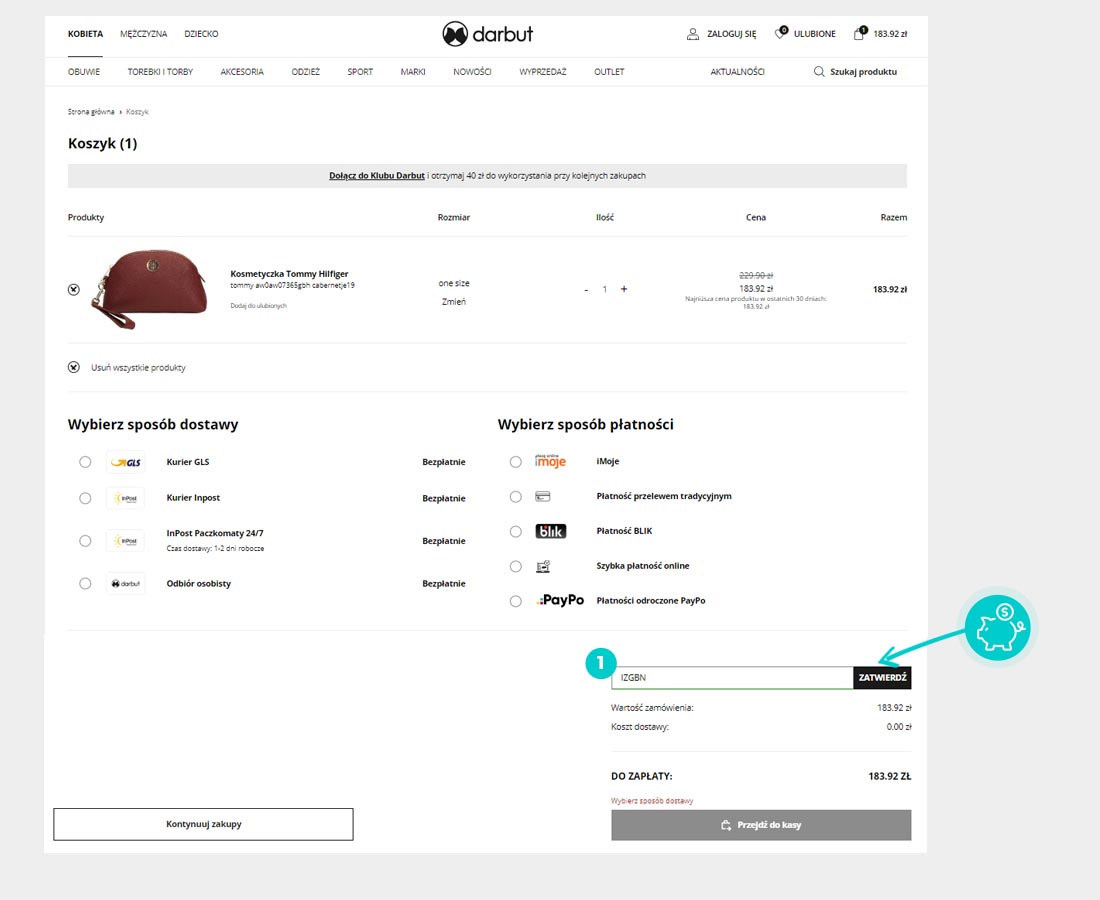 Wybierz w e-sklepie Darbut.pl produkt, który Cię interesuje, naciśnij przycisk "Dodaj do koszyka", a produkt automatycznie zostanie dodany do Twojego koszyka z zamówieniem. Po prawej stronie, w sekcji "Koszyk" znajdziesz pole "Kod rabatowy". Tutaj wklej skopiowany kod rabatowy bądź wprowadź go ręcznie, i zatwierdź przyciskiem "Zatwierdź", a następnie "Przejdź do kasy".