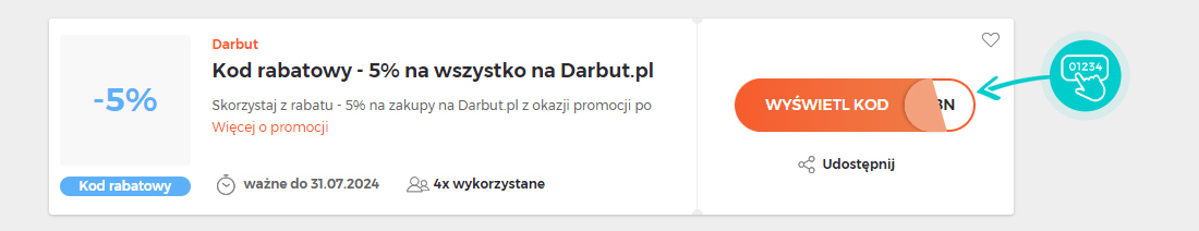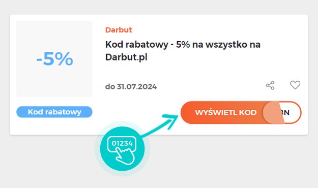 Wybierz na naszej stronie konkretny kod rabatowy, którego chcesz użyć w sklepie internetowym Darbut.pl. Następnie kliknij pomarańczowy przycisk "Wyświetl kod".