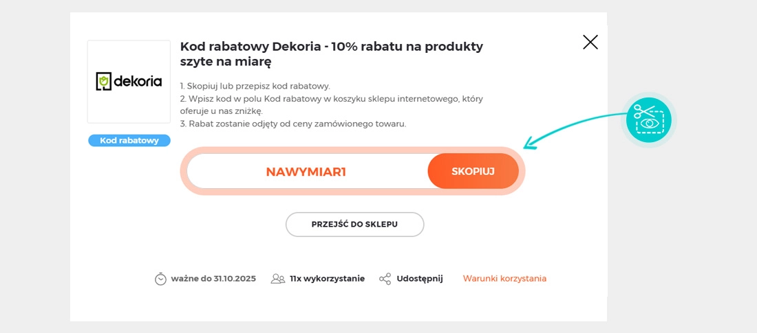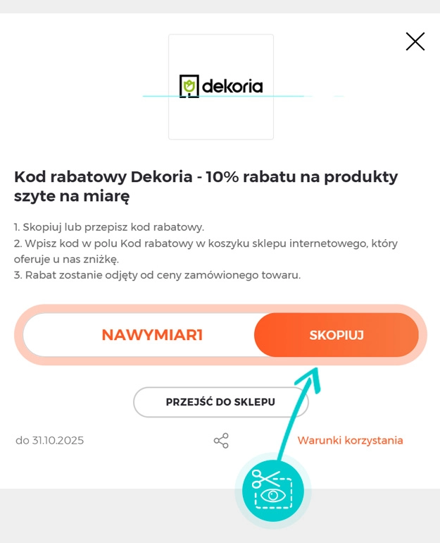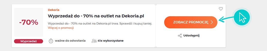 Wybierz konkretny rabat Dekoria na naszej stronie i kliknij przycisk "Zobacz promocje". Zostaniesz automatycznie przekierowany bezpośrednio do oferty specjalnej w sklepie internetowym Dekoria.pl, w którym możesz kupić produkt ze zniżką.