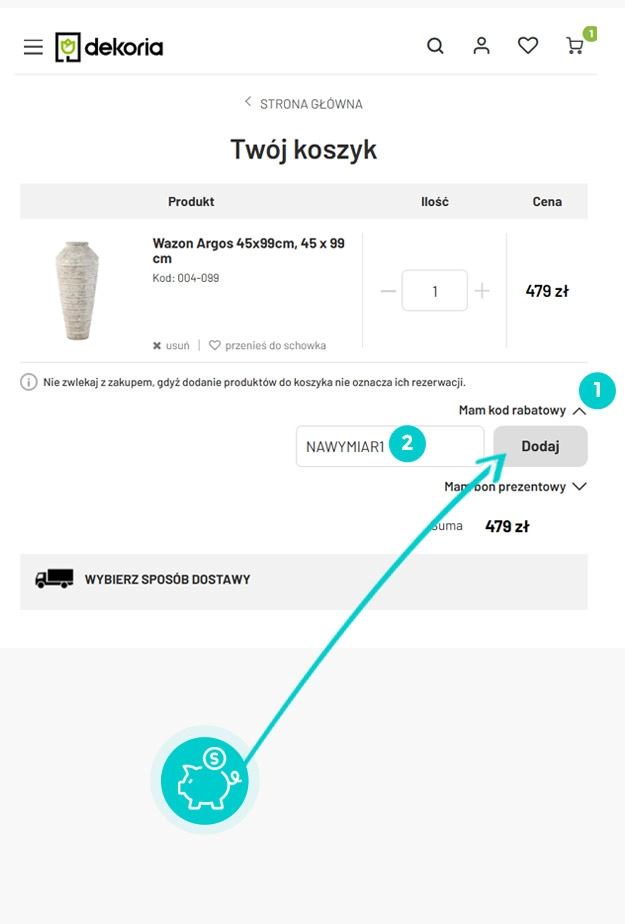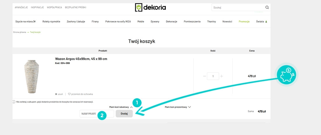 Wybierz produkt w e-sklepie Dekoria.pl, który Cię interesuje, naciśnij przycisk "Kup", a produkt zostanie automatycznie dodany do koszyka. Bezpośrednio w koszyku znajdziesz pole „Kod rabatowy” pod wybranym produktem. Wpisz tutaj skopiowany kod rabatowy lub wprowadź go ręcznie i potwierdź przyciskiem „Zatwierdź”.