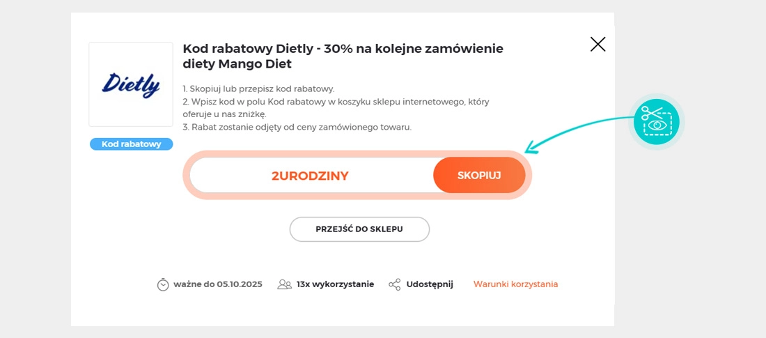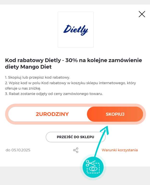 Skopiuj lub zapisz kod rabatowy i kliknij przycisk "Przejdź do sklepu". Nastąpi przekierowanie bezpieśrednio do sklepu internetowego Dietly.pl.