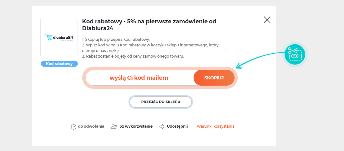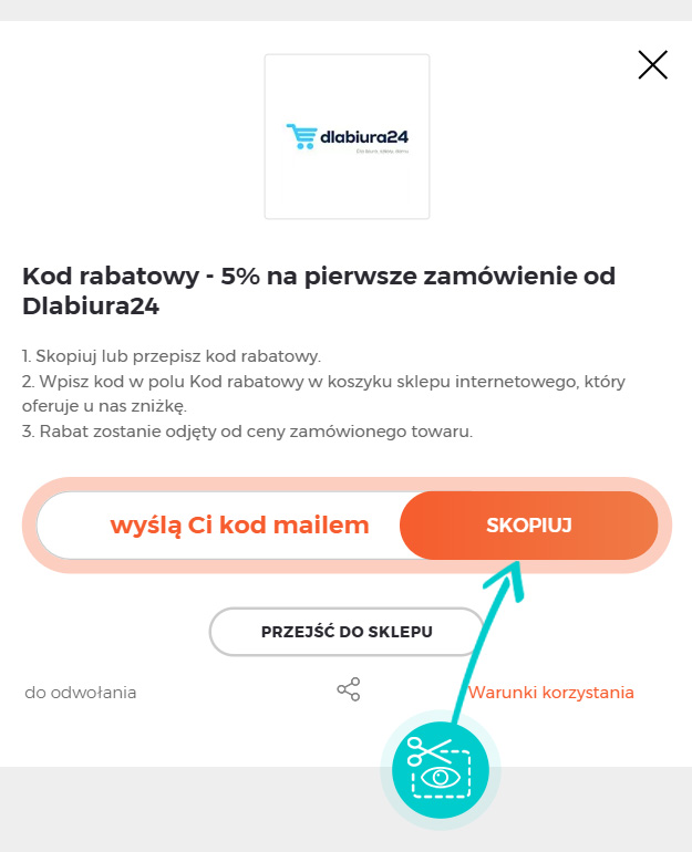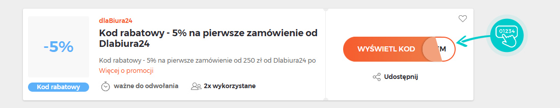 Wybierzcie na naszej stronie konkretny kod rabatowy, którego chcecie użyć w sklepie internetowym Dlabiura24.pl. Następnie kliknijcie pomarańczowy przycisk "Wyświetl kod".