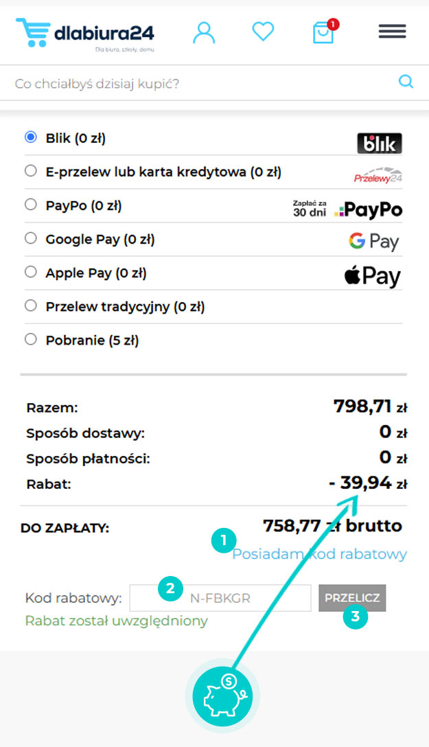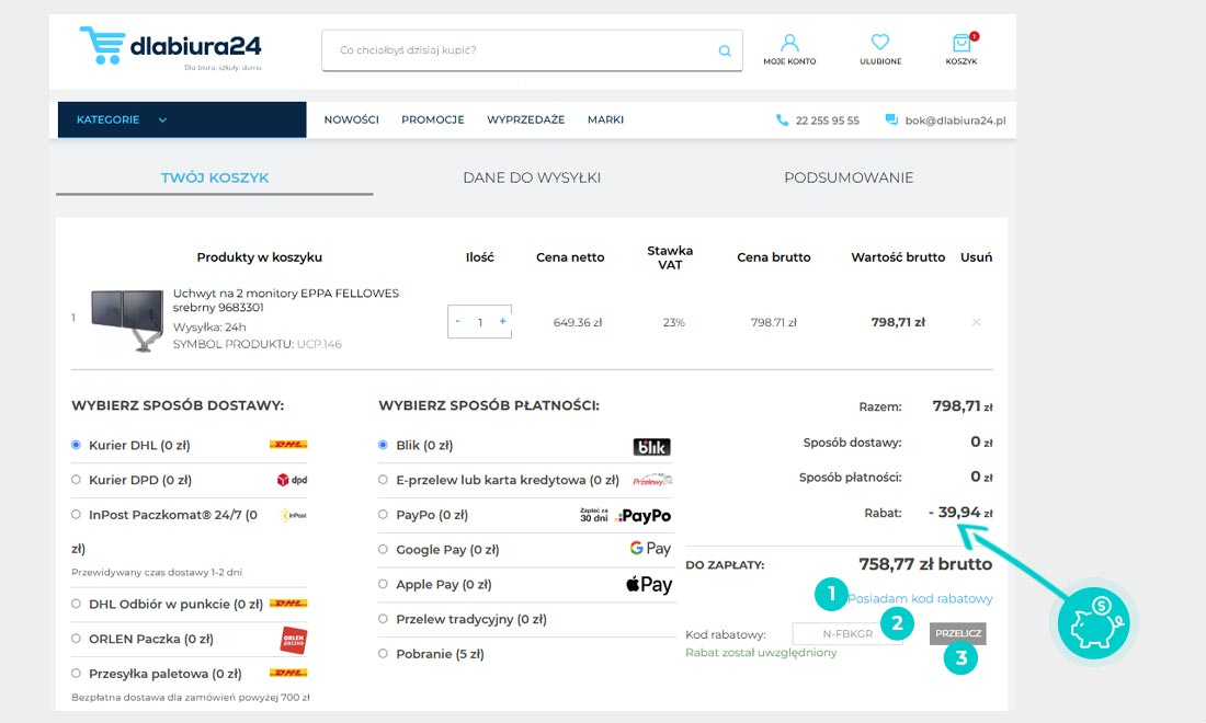 Wybierzcie w e-sklepie Dlabiura24.pl produkt, który was interesuje, naciśnijcie przycisk "Do koszyka", a produkt automatycznie zostanie dodany do waszego koszyka z zamówieniem. Po prawej stronie, w sekcji "Twój Koszyk" znajdziecie pole "Posiadam kod rabatowy". Tutaj wklejcie skopiowany kod rabatowy bądź wprowadźcie go ręcznie, i zatwierdźcie przyciskiem "Przelicz", a następnie "Przejdź dalej".