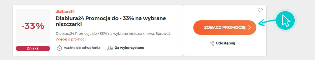 Wybierzcie konkretny rabat z DlaBiura24 na naszej stronie i kliknijcie przycisk "Zobacz promocję". Zostaniecie automatycznie przekierowani do oferty promocyjnej w sklepie internetowym Dlabiura24.pl, gdzie możecie kupić wybrany produkt ze świetną zniżką.