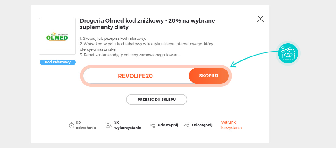 Skopiuj lub zapisz kod rabatowy i kliknij przycisk "Przejdź do sklepu". Nastąpi przekierowanie bezpieśrednio do sklepu internetowego Drogeriaolmed.pl.