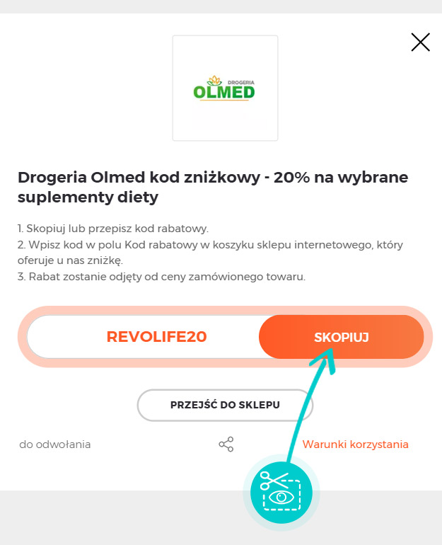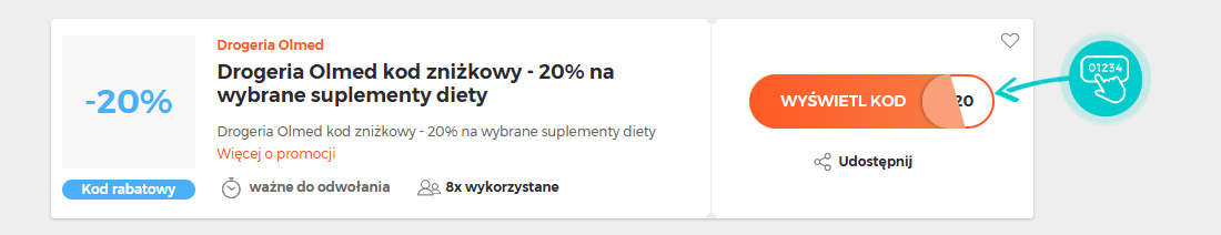 Wybierz na naszej stronie określony kod rabatowy, który chcesz zastosować w sklepie internetowym Drogeriaolmed.pl. Kliknij pomarańczowy przycisk „Wyświetl kod”.
