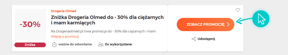 Wybierz konkretny rabat Drogeria Olmed na naszej stronie i kliknij przycisk "Zobacz promocje". Zostaniesz automatycznie przekierowany bezpośrednio do oferty specjalnej w sklepie internetowym Drogeriaolmed.pl, w którym możesz kupić produkt ze zniżką.