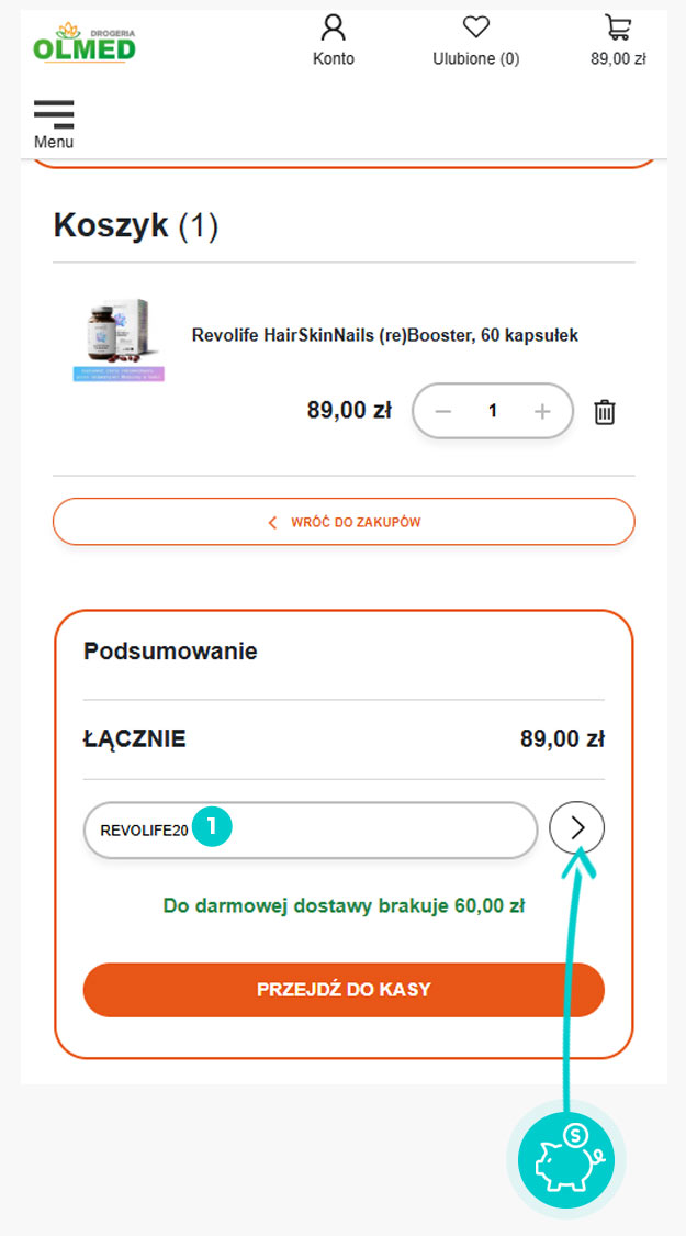 Wybierz produkt w e-sklepie Drogeriaolmed.pl który Cię interesuje, naciśnij przycisk "Kup", a produkt zostanie automatycznie dodany do koszyka. Bezpośrednio w koszyku znajdziesz pole „Kupon podarunkowy lub rabatowy” pod wybranym produktem. Wpisz tutaj skopiowany kod rabatowy lub wprowadź go ręcznie i potwierdź przyciskiem „Zastosuj”.
