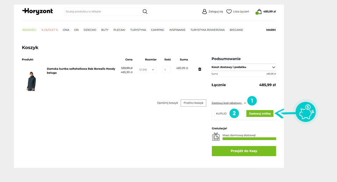 Wybierz produkt w e-sklepie E-horyzont.pl który Cię interesuje, naciśnij przycisk "Kup", a produkt zostanie automatycznie dodany do koszyka. Bezpośrednio w koszyku znajdziesz pole „Kupon podarunkowy lub rabatowy” pod wybranym produktem. Wpisz tutaj skopiowany kod rabatowy lub wprowadź go ręcznie i potwierdź przyciskiem „Zastosuj”.