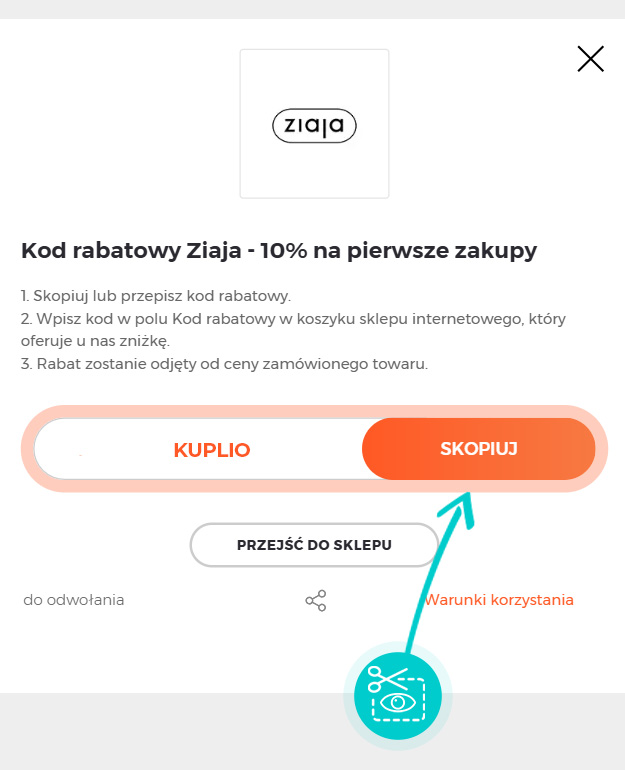 Skopiuj lub zapisz kod rabatowy i kliknij przycisk "Przejdź do sklepu". Nastąpi przekierowanie bezpieśrednio do sklepu internetowego Ziaja.com.