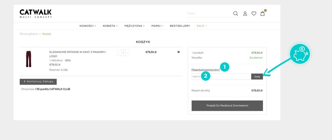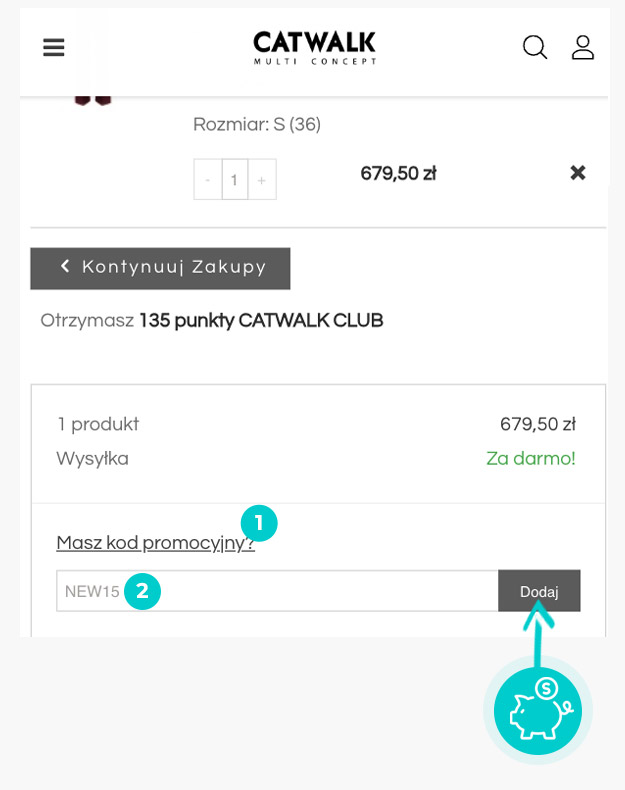 Wybierzcie w e-sklepie E-catwalk.pl produkt, który was interesuje, naciśnijcie przycisk "Dodaj do koszyka", a produkt automatycznie zostanie dodany do waszego koszyka z zamówieniem. Po prawej stronie, w sekcji "Koszyk" znajdziecie pole "Masz kod promocyjny?". Tutaj wklejcie skopiowany kod rabatowy bądź wprowadźcie go ręcznie, i zatwierdźcie przyciskiem "Dodaj", a następnie "Przejdź do realizacji zamówienia".