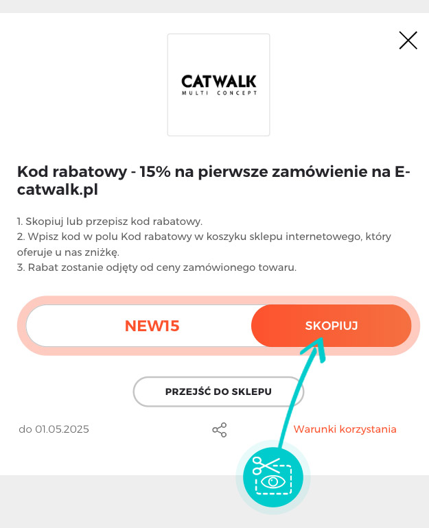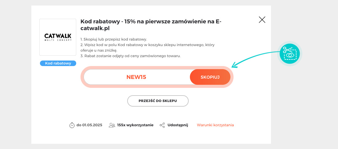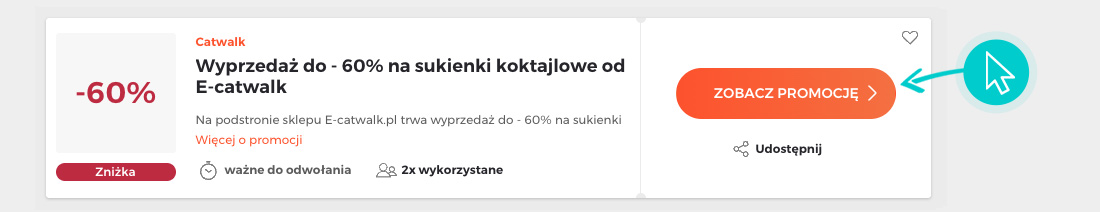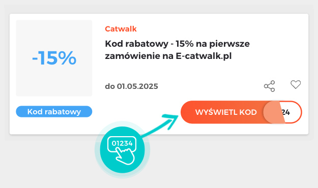 Wybierzcie konkretny rabat z Catwalk na naszej stronie i kliknijcie przycisk "Zobacz promocję". Zostaniecie automatycznie przekierowani do oferty promocyjnej w sklepie internetowym E-catwalk.pl, gdzie możecie kupić wybrany produkt ze świetną zniżką.