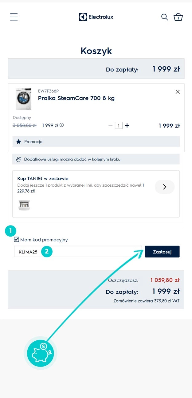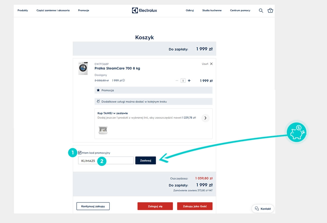 Wybierz produkt w e-sklepie Electrolux.pl który Cię interesuje, naciśnij przycisk "Kup", a produkt zostanie automatycznie dodany do koszyka. Bezpośrednio w koszyku znajdziesz pole „Kupon podarunkowy lub rabatowy” pod wybranym produktem. Wpisz tutaj skopiowany kod rabatowy lub wprowadź go ręcznie i potwierdź przyciskiem „Zastosuj”.