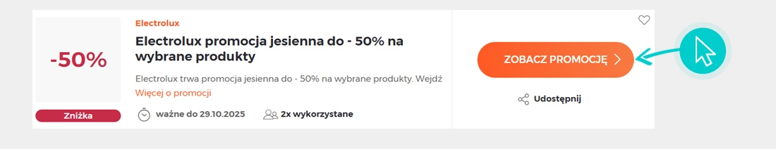 Wybierz konkretny rabat Electrolux na naszej stronie i kliknij przycisk "Zobacz promocje". Zostaniesz automatycznie przekierowany bezpośrednio do oferty specjalnej w sklepie internetowym Electrolux.pl, w którym możesz kupić produkt ze zniżką.