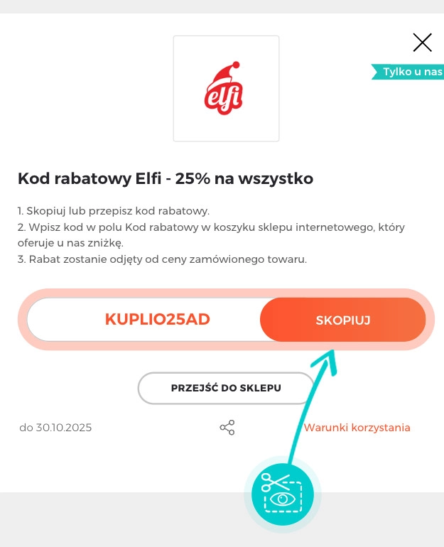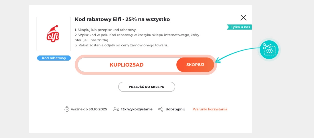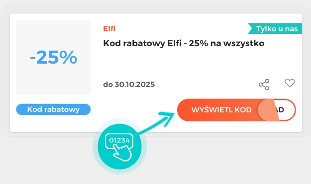 Skopiuj lub zapisz kod rabatowy i kliknij przycisk "Przejdź do sklepu". Nastąpi przekierowanie bezpieśrednio do sklepu internetowego Elfi.pl.