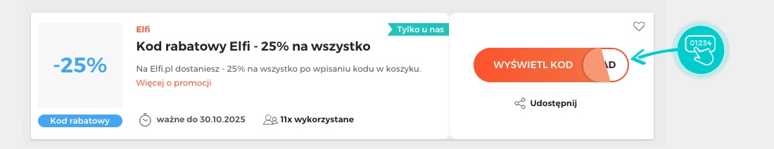 Wybierz na naszej stronie określony kod rabatowy, który chcesz zastosować w sklepie internetowym Elfi.pl. Kliknij pomarańczowy przycisk „Wyświetl kod”.