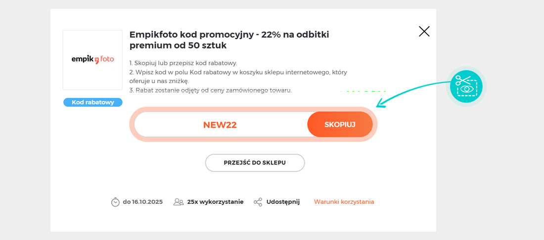 Skopiuj lub zapisz kod rabatowy i kliknij przycisk "Przejdź do sklepu". Nastąpi przekierowanie bezpieśrednio do sklepu internetowego Empikfoto.pl.