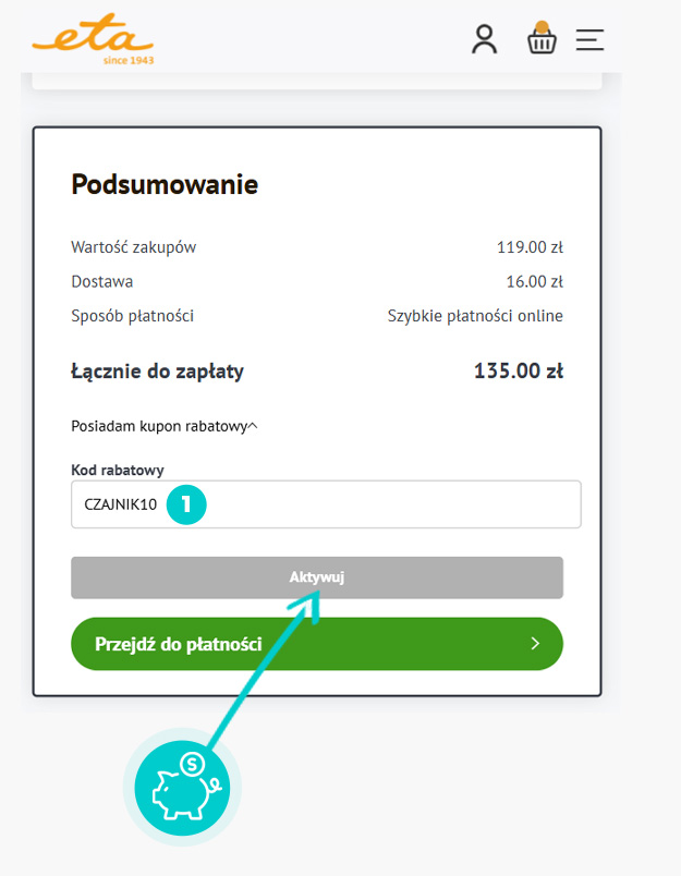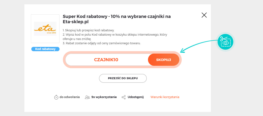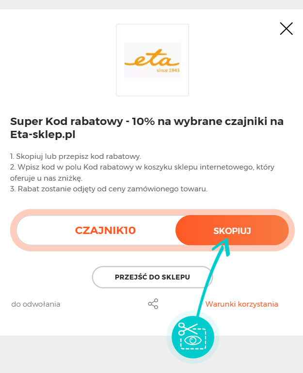 Skopiuj lub zapisz kod rabatowy i kliknij przycisk "Przejdź do sklepu". Nastąpi przekierowanie bezpieśrednio do sklepu internetowego Eta-sklep.pl.