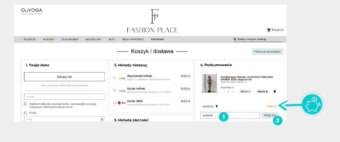 Wybierzcie w e-sklepie Fashionplace.pl produkt, który was interesuje, naciśnijcie przycisk "Dodaj do koszyka", a produkt automatycznie zostanie dodany do waszego koszyka z zamówieniem. Po prawej stronie, w sekcji "Koszyk" znajdziecie pole "Kod promocyjny". Tutaj wklejcie skopiowany kod rabatowy bądź wprowadźcie go ręcznie, i zatwierdźcie przyciskiem "Przelicz", a następnie "Zamawiam i płacę".