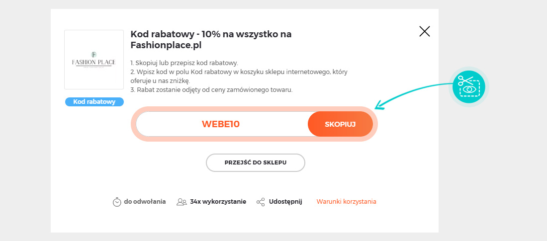 Skopiujcie lub zapiszcie kod rabatowy, a następnie kliknijcie przycisk "Przejdź do sklepu". Zostaniecie automatycznie przekierowani do sklepu internetowego Fashionplace.pl.