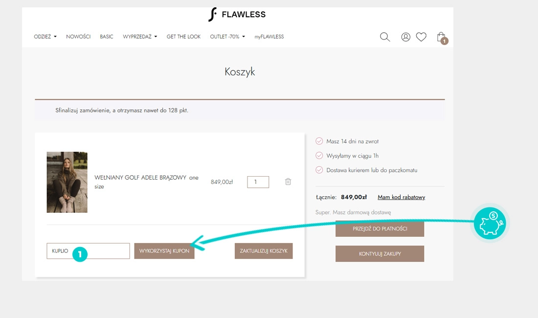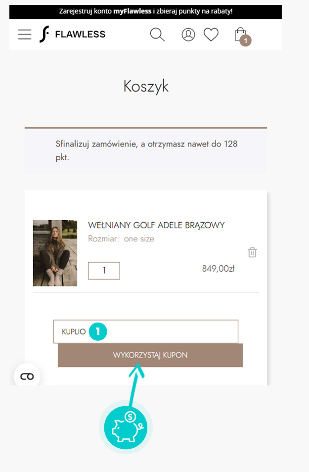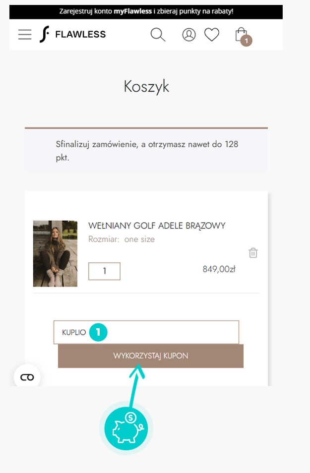 Wybierz produkt w e-sklepie Flawless.pl który Cię interesuje, naciśnij przycisk "Kup", a produkt zostanie automatycznie dodany do koszyka. Bezpośrednio w koszyku znajdziesz pole „Kupon podarunkowy lub rabatowy” pod wybranym produktem. Wpisz tutaj skopiowany kod rabatowy lub wprowadź go ręcznie i potwierdź przyciskiem „Zastosuj”.