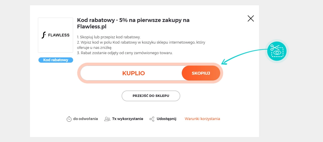 Skopiuj lub zapisz kod rabatowy i kliknij przycisk "Przejdź do sklepu". Nastąpi przekierowanie bezpieśrednio do sklepu internetowego Flawless.pl.