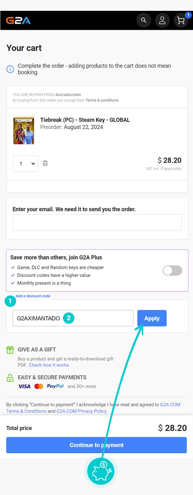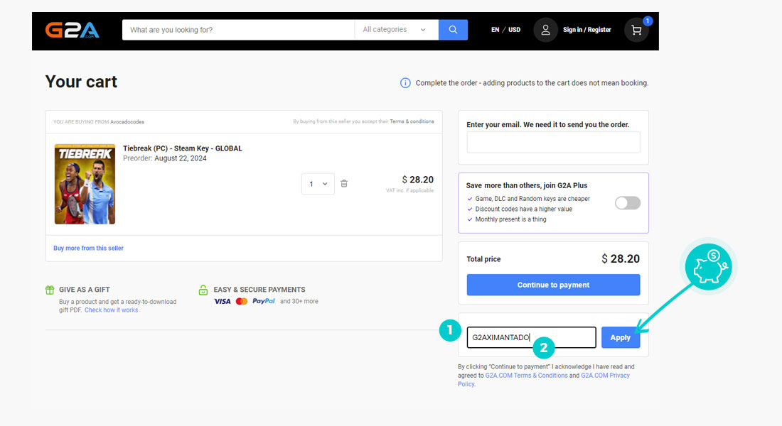 Wybierzcie w e-sklepie G2a.com produkt, który was interesuje, naciśnijcie przycisk "Add", a produkt automatycznie zostanie dodany do waszego koszyka z zamówieniem. Po prawej stronie, w sekcji "Your cart" znajdziecie pole "Add discount code". Tutaj wklejcie skopiowany kod rabatowy bądź wprowadźcie go ręcznie, i zatwierdźcie przyciskiem "Apply", a następnie "Continue to payment".