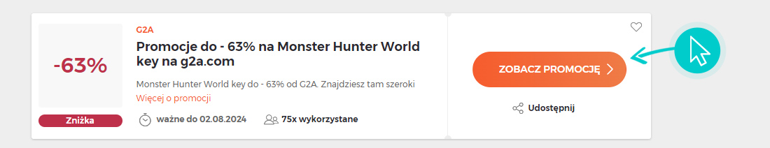 Wybierzcie konkretny rabat z G2A na naszej stronie i kliknijcie przycisk "Zobacz promocję". Zostaniecie automatycznie przekierowani do oferty promocyjnej w sklepie internetowym G2a.com, gdzie możecie kupić wybrany produkt ze świetną zniżką.