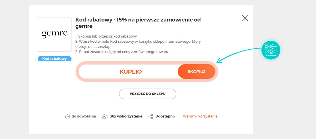 Skopiuj lub zapisz kod rabatowy i kliknij przycisk "Przejdź do sklepu". Nastąpi przekierowanie bezpieśrednio do sklepu internetowego Gemre.com.pl.