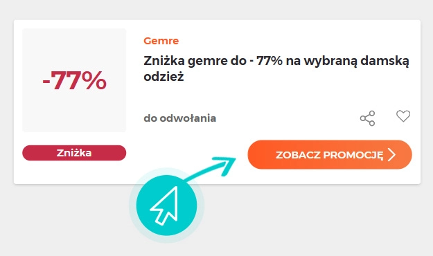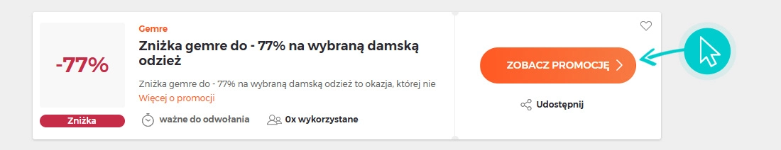 Wybierz konkretny rabat Gemre na naszej stronie i kliknij przycisk "Zobacz promocje". Zostaniesz automatycznie przekierowany bezpośrednio do oferty specjalnej w sklepie internetowym Gemre.com.pl, w którym możesz kupić produkt ze zniżką.