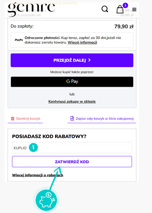 Wybierz produkt w e-sklepie Gemre.com.pl który Cię interesuje, naciśnij przycisk "Kup", a produkt zostanie automatycznie dodany do koszyka. Bezpośrednio w koszyku znajdziesz pole „Kupon podarunkowy lub rabatowy” pod wybranym produktem. Wpisz tutaj skopiowany kod rabatowy lub wprowadź go ręcznie i potwierdź przyciskiem „Zastosuj”.