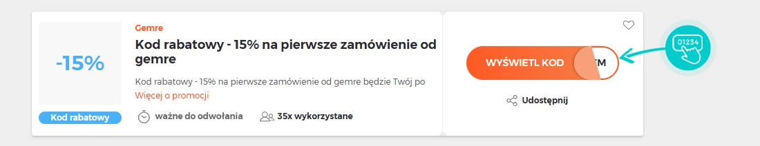 Wybierz na naszej stronie określony kod rabatowy, który chcesz zastosować w sklepie internetowym Gemre.com.pl. Kliknij pomarańczowy przycisk „Wyświetl kod”.