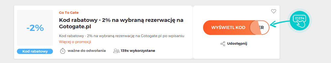 Kod rabatowy - 2% na wybraną rezerwację na Gotogate.pl po wpisaniu kodu. Wejdź na stronę.