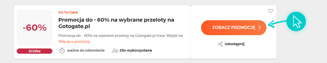 Wybierz konkretny rabat Go to gate na naszej stronie i kliknij przycisk "Zobacz promocje". Zostaniesz automatycznie przekierowany bezpośrednio do oferty specjalnej w sklepie internetowym Gotogate.pl, w którym możesz kupić produkt ze zniżką.