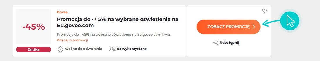 Wybierz konkretny rabat Govee na naszej stronie i kliknij przycisk "Zobacz promocje". Zostaniesz automatycznie przekierowany bezpośrednio do oferty specjalnej w sklepie internetowym Eu.govee.com, w którym możesz kupić produkt ze zniżką.