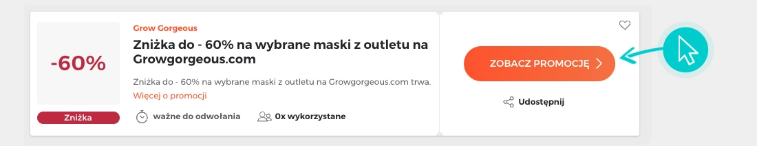Wybierz konkretny rabat Grow Gorgeous na naszej stronie i kliknij przycisk "Zobacz promocje". Zostaniesz automatycznie przekierowany bezpośrednio do oferty specjalnej w sklepie internetowym Growgorgeous.com, w którym możesz kupić produkt ze zniżką.