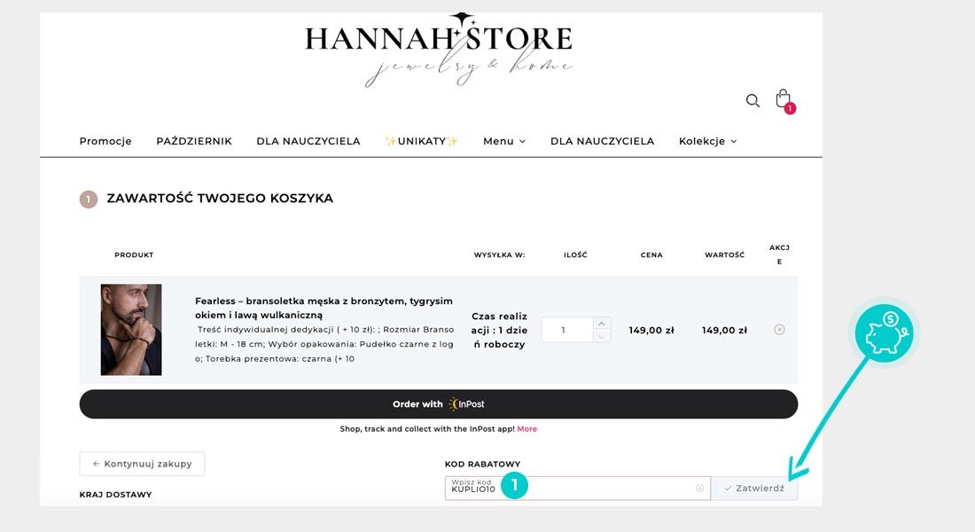 Wybierz produkt w e-sklepie Hannahstore.pl który Cię interesuje, naciśnij przycisk "Kup", a produkt zostanie automatycznie dodany do koszyka. Bezpośrednio w koszyku znajdziesz pole „Kupon podarunkowy lub rabatowy” pod wybranym produktem. Wpisz tutaj skopiowany kod rabatowy lub wprowadź go ręcznie i potwierdź przyciskiem „Zastosuj”.