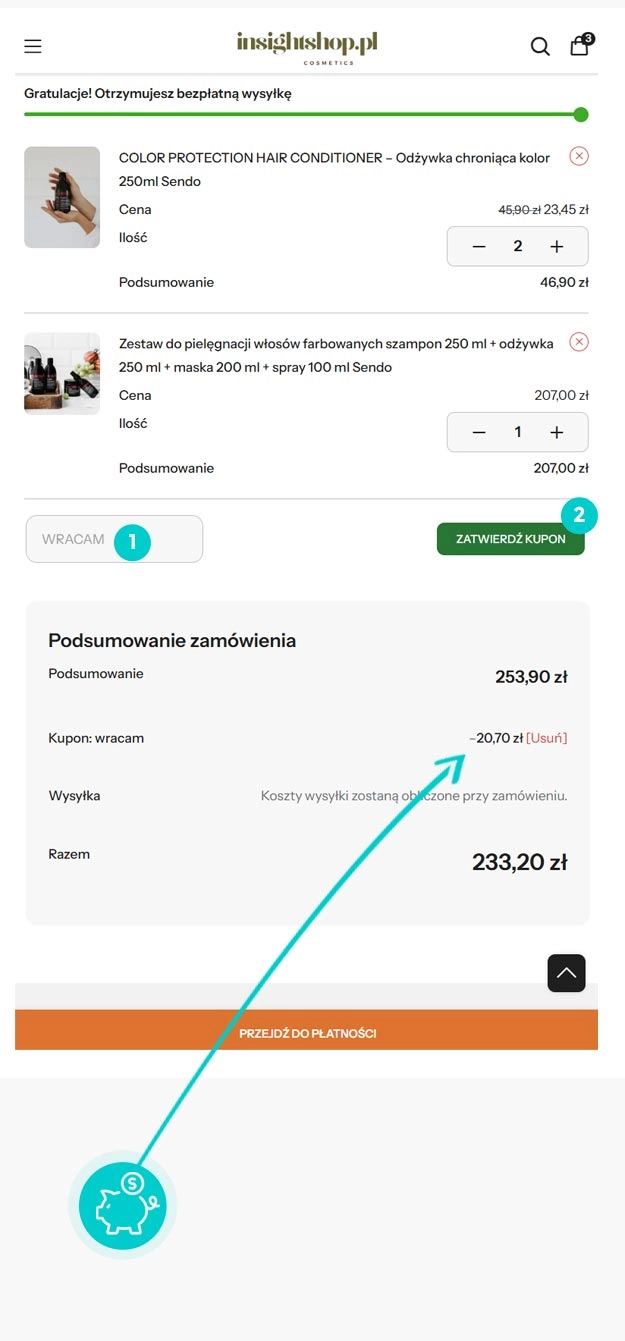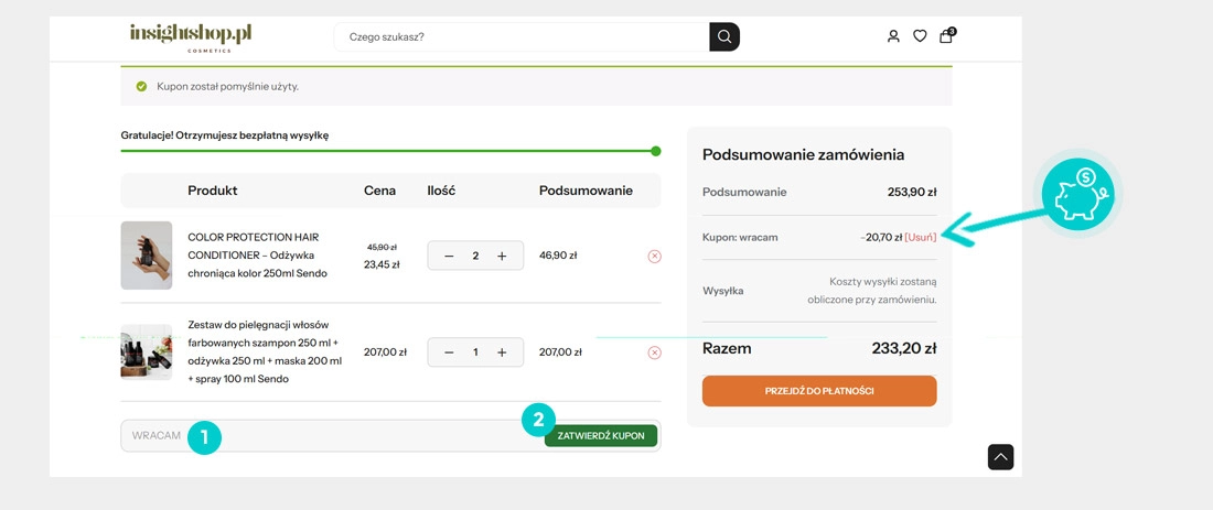 Wybierzcie w e-sklepie Insightshop.pl produkt, który was interesuje, naciśnijcie przycisk "Dodaj do koszyka", a produkt automatycznie zostanie dodany do waszego koszyka z zamówieniem. Po prawej stronie, w sekcji "Koszyk" znajdziecie pole "Kod kuponu". Tutaj wklejcie skopiowany kod rabatowy bądź wprowadźcie go ręcznie, i zatwierdźcie przyciskiem "Zatwierdź kupon", a następnie "Przejdź do płatności".