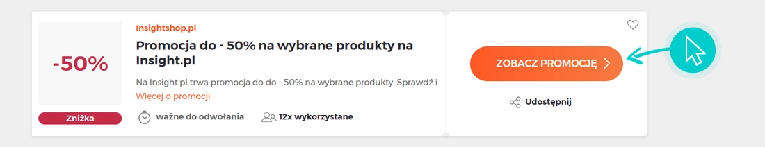 Wybierzcie konkretny rabat z Insightshop.pl na naszej stronie i kliknijcie przycisk "Zobacz promocję". Zostaniecie automatycznie przekierowani do oferty promocyjnej w sklepie internetowym Insightshop.pl, gdzie możecie kupić wybrany produkt ze świetną zniżką.