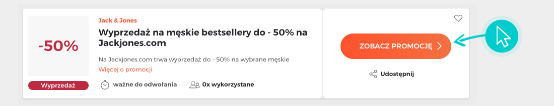 Wybierz konkretny rabat Jack & Jones na naszej stronie i kliknij przycisk "Zobacz promocje". Zostaniesz automatycznie przekierowany bezpośrednio do oferty specjalnej w sklepie internetowym Jackjones.com, w którym możesz kupić produkt ze zniżką.