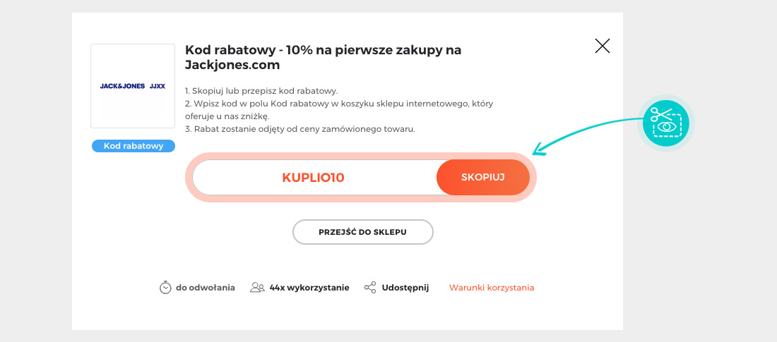 Skopiuj lub zapisz kod rabatowy i kliknij przycisk "Przejdź do sklepu". Nastąpi przekierowanie bezpieśrednio do sklepu internetowego Jackjones.com.