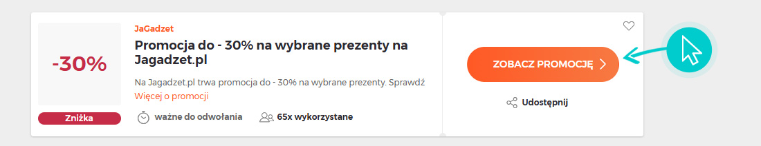 Wybierz konkretny rabat z JaGadzet na naszej stronie i kliknij przycisk "Zobacz promocję". Zostaniesz automatycznie przekierowany do oferty promocyjnej w sklepie internetowym JaGadzet, gdzie możesz kupić wybrany produkt ze świetną zniżką.
