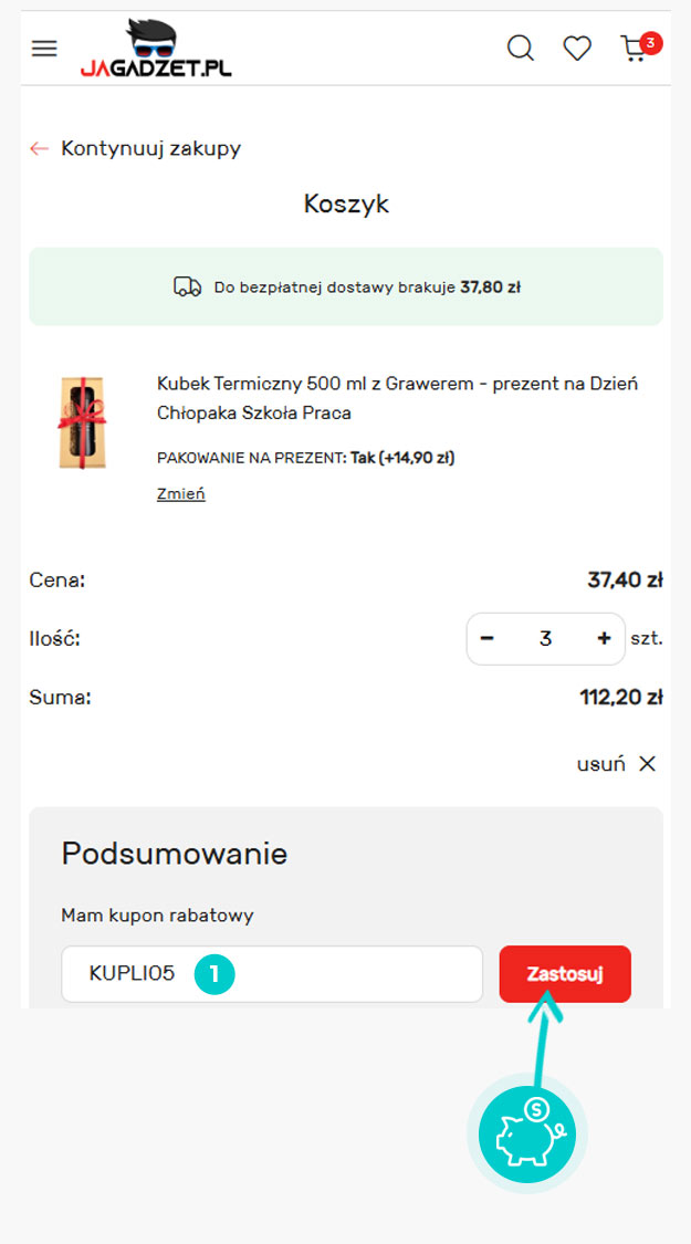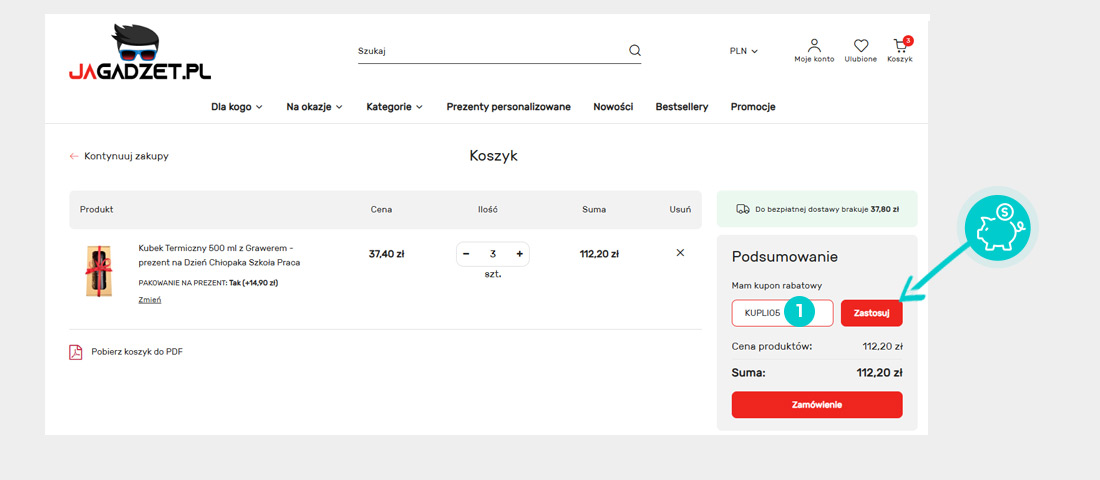 Wybierz w e-sklepie JaGadzet produkt, który Cię interesuje, naciśnij przycisk "Dodaj do koszyka", a produkt automatycznie zostanie dodany do Twojego koszyka z zamówieniem. Po prawej stronie, w sekcji "Twój koszyk" znajdziesz pole "Masz kod rabatowy?". Tutaj wklej skopiowany kod rabatowy bądź wprowadź go ręcznie, i zatwierdź przyciskiem "Przejdź dalej".