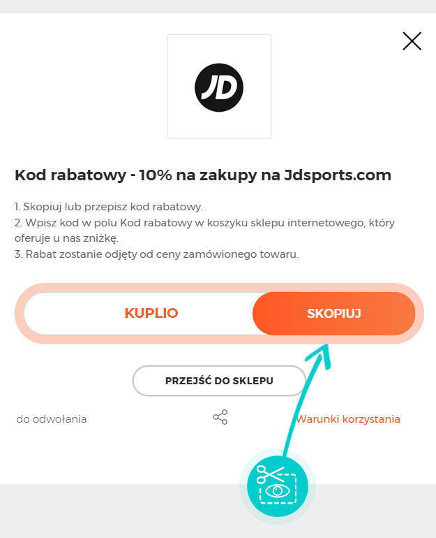 Skopiuj lub zapisz kod rabatowy i kliknij przycisk "Przejdź do sklepu". Nastąpi przekierowanie bezpieśrednio do sklepu internetowego Jdsports.pl.