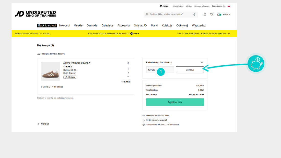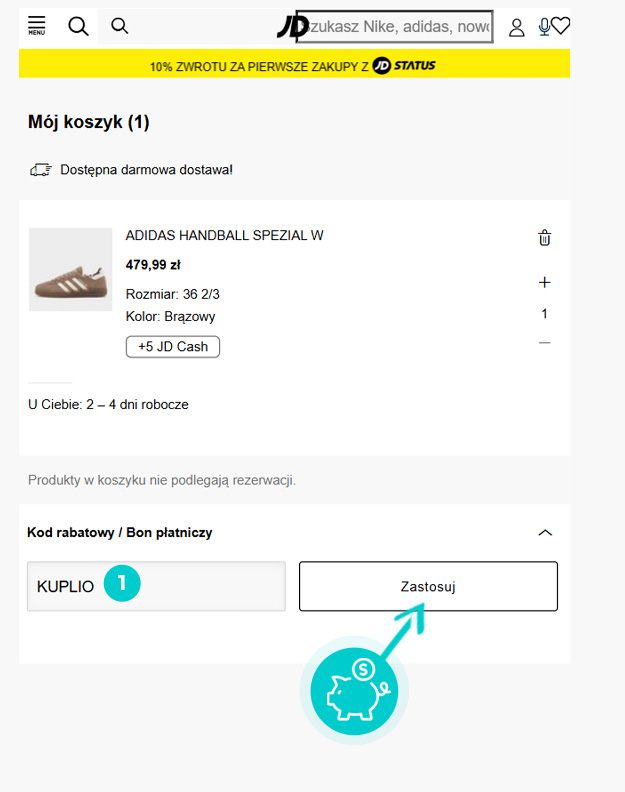 Wybierz produkt w e-sklepie Jdsports.pl który Cię interesuje, naciśnij przycisk "Kup", a produkt zostanie automatycznie dodany do koszyka. Bezpośrednio w koszyku znajdziesz pole „Kupon podarunkowy lub rabatowy” pod wybranym produktem. Wpisz tutaj skopiowany kod rabatowy lub wprowadź go ręcznie i potwierdź przyciskiem „Zastosuj”.