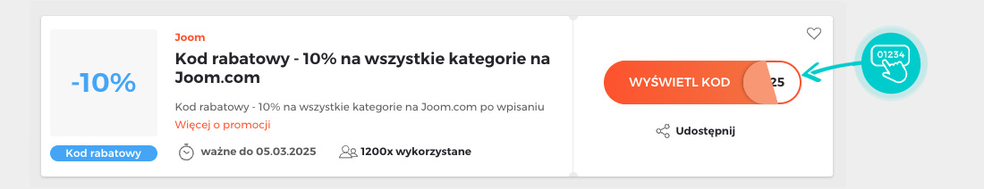 Wybierz na naszej stronie określony kod rabatowy, który chcesz zastosować w sklepie internetowym Joom.com. Kliknij pomarańczowy przycisk „Wyświetl kod”.